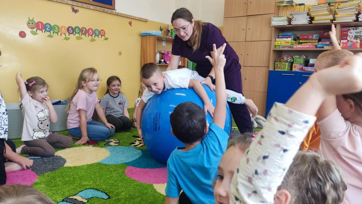 Do grupy Krasnoludków zawitał wyjątkowy gość. Była to Pani Honorata - fizjoterapeutka dziecięca, która przybliżyła dzieciom swoją pracę i opowiedziała na czym polega dbanie o zdrowy rozwój ciała. Podczas wizyty każde dziecko miała okazję wykonać odcisk swojej stopy oraz wziąć udział w krótkim badaniu postawy. Pani Honorata zaprezentowała również zestaw prostych ćwiczeń. Dużym zainteresowaniem cieszyły się ćwiczenia na piłce, które sprawiły dzieciom wiele radości. Spotkanie było nie tylko bardzo ciekawe, ale i bardzo pouczające - dzieci po raz kolejny usłyszały jak ważny jest ruch i dbanie o własne zdrowie. Z całego serca dziękujemy Pani Honoracie za wspólny czas i niezapomniane zajęcia.